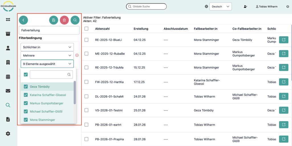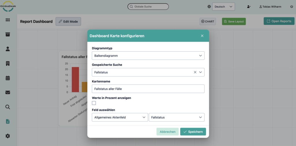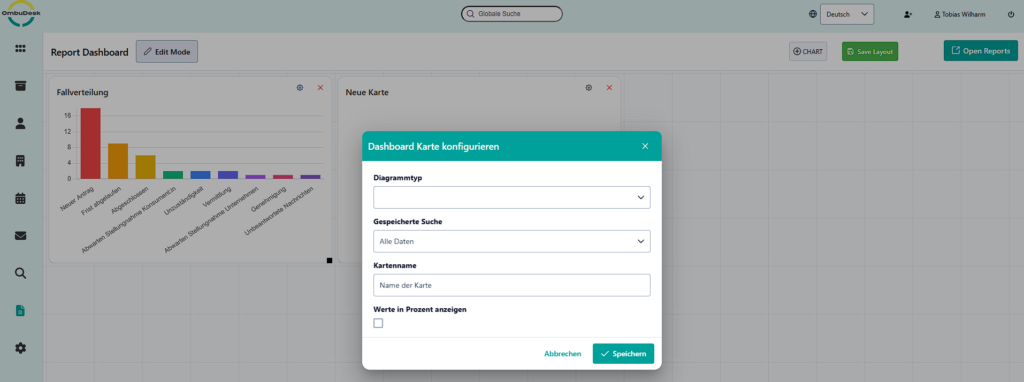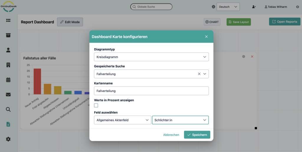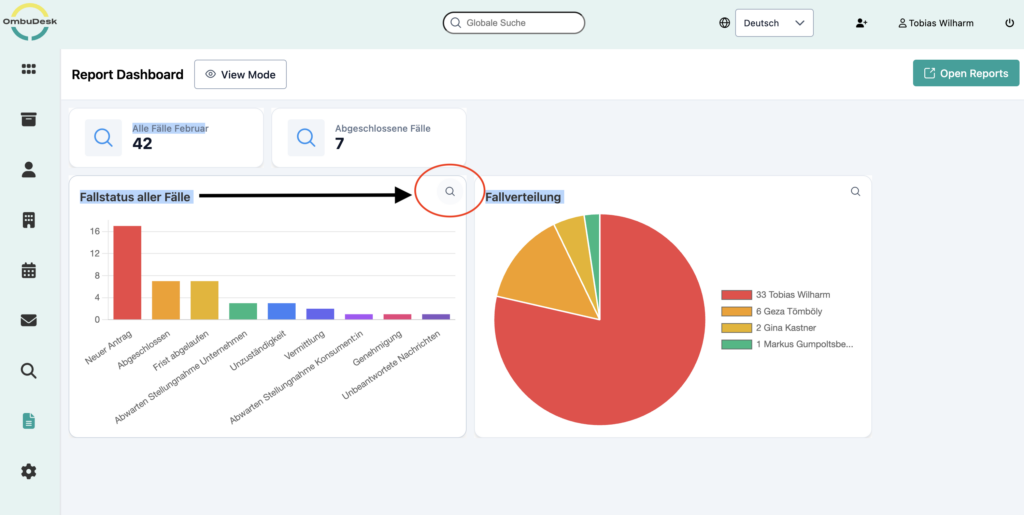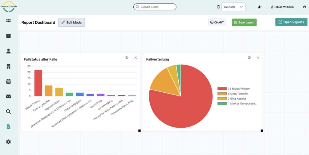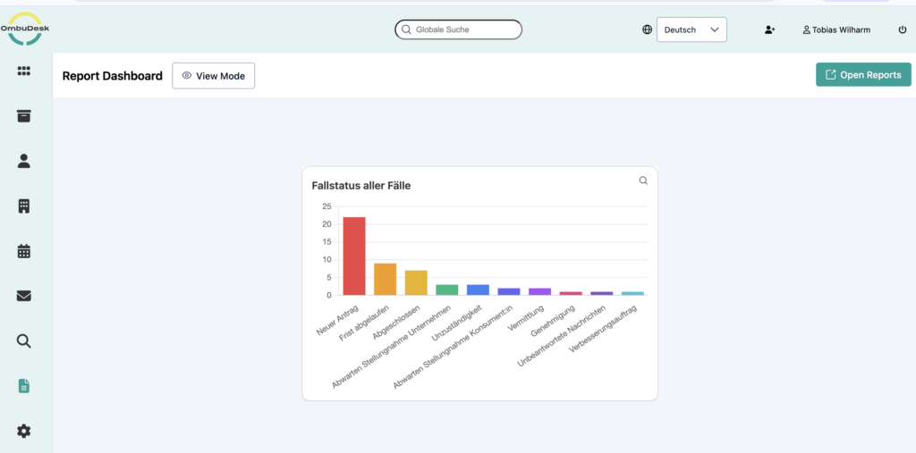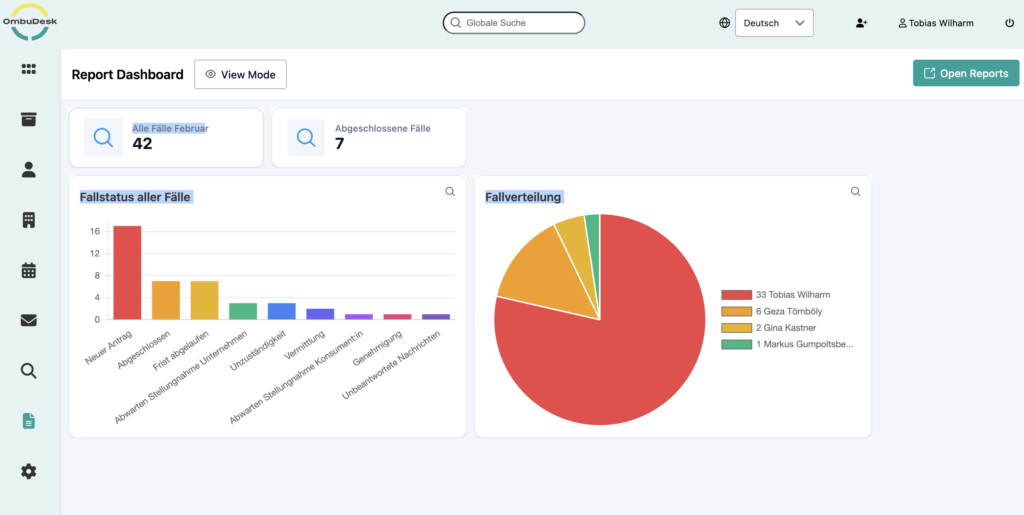 If you use OmbuDesk, you can easily benefit from the new feature. If the feature has already been integrated for your mediation or ombudsman's office, you will find the report dashboard in the left-hand menu under "Reports".